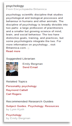 Topic Explorer: When patrons perform a keyword search in Summon, the Topic Explorer pane opens on the right panel of the results screen, showing reference content, related topics, a recommended subject specialist to contact, and up to three research guides for the patron to explore. The topic explorer has over 50,000 topics associated with keywords found in actual Summon search logs, and it creates a great jumping off point for patrons to explore a new topic. As an undergraduate I had no idea there were subject specialist librarians, and I love that Summon points patrons directly to them as a resource.